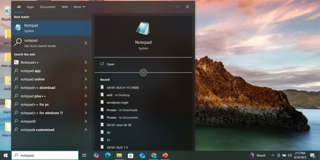 Go to Start Screen bottem left cornes and click in the box( search web and pc). Type Notepad.and open it.